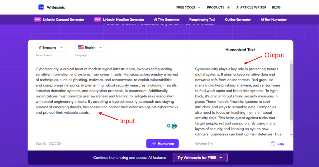Free AI Text Humanizer is an AI tool offered by Writesonic. Writesonic is a popular AI writing service. To start with it, you can simply paste your content into its editor. There’s a limit of 200 words for each time you run the humanizer.